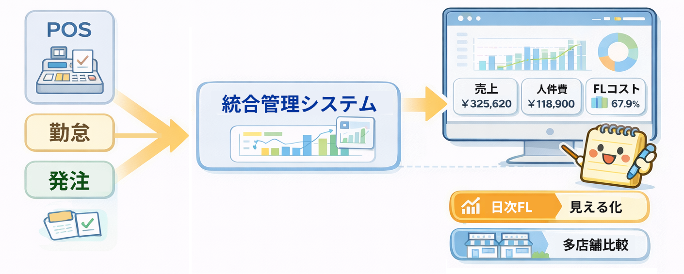 POS・勤怠・発注データを一元化し、日次で状況を可視化できるようになると、FLコストの把握と改善、店舗間比較、成功事例の横展開が進めやすくなります。